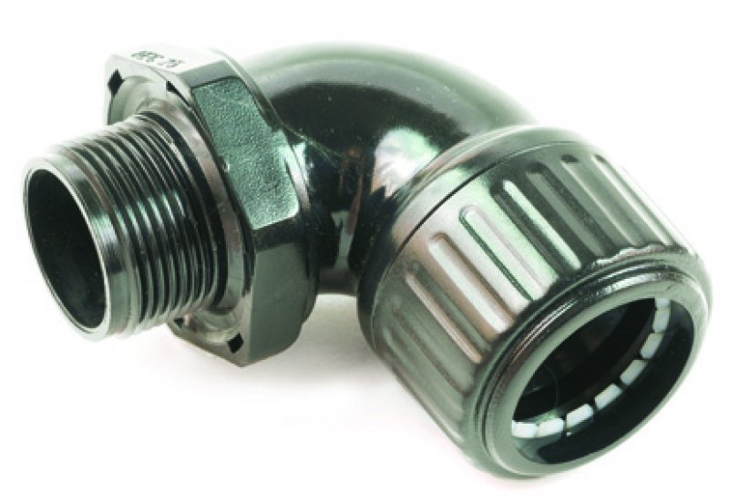 HEG, dławik kątowy bezhalogenowy; czarny (RAL 9005, UV - odporna), opatentowany system szybkiego montażu, wytrzymały na rozciąganie, z gwintem metrycznym, IP 54