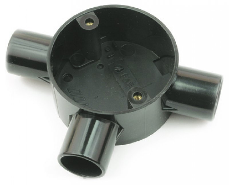 HFCB, puszka bezhalogenowa okrągła, według British Standards BS 4607: Part 5; czarna (RAL 9005) lub biała 9RAL 9010), z 2 gniazdami śrub, odległość śrub50,8 mm (2÷) do rur od 16 mm do 25 mm, lub 65 mm, do rur 32 mm, z wkładkami mosiężnymi M 4, bez p