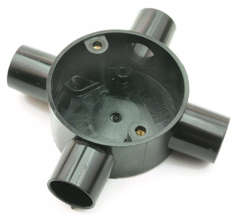 HFCB, puszka bezhalogenowa okrągła, według British Standards BS 4607: Part 5; czarna (RAL 9005) lub biała 9RAL 9010), z 2 gniazdami śrub, odległość śrub50,8 mm (2÷) do rur od 16 mm do 25 mm, lub 65 mm, do rur 32 mm, z wkładkami mosiężnymi M 4, bez p