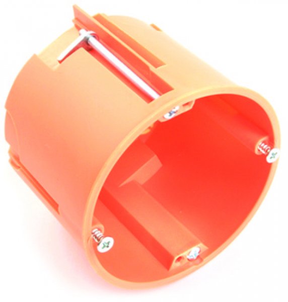 HWAD, puszka rozgałęźna głęboka; pomarańczowa (RAL 2004), rozstaw śrub 60 mm, wymagany otwór do montowania średnica 68 mm, zewnętrzny brzeg puszki średnica 71 mm, grubość płyty 7 do 35 mm, maks. 4 wejścia rur średnica 20 mm, 2 wejścia kabli